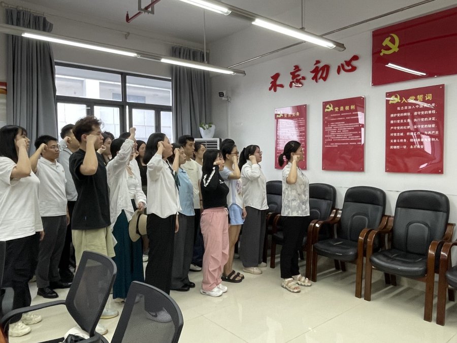 接着,大会举行了入党宣誓仪式。全体起立,奏唱《国际歌》,气氛庄重而肃穆。随后,刘菁老师领誓入党誓词,全体党员面向鲜红的党旗,右手紧握成拳,庄严宣誓。每位党员都饱含着真挚的情感和坚定的决心,用发自肺腑的声音表达出对党的忠诚和献身于党的事业的坚定承诺。