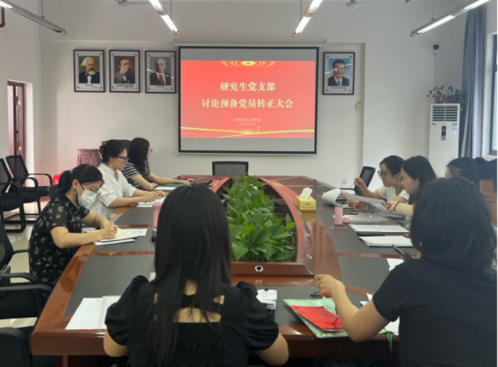 2025年6月5日下午14:30,马克思主义学院研究生党支部在博文楼南1010会议室召开了预备党员转正大会,本次会议由研究生党支部副书记李昕珂主持,刘菁老师、研究生党支部全体党员参加会议。