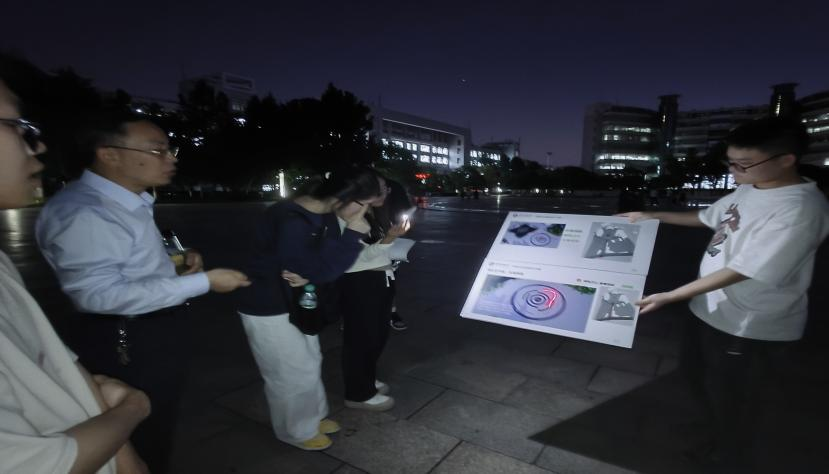 当夜幕降临,周老师带领同学们来到陶铸广场。尽管天色昏暗,同学们自发打开灯光照亮老师的课件纸板。在这里,周老师为大家解读了陶铸广场“天圆地方”的文化理念,以及广场两边有着上亿年历史的木化石“双木成林”的寓意,介绍了学校东西园办学布局,以及学校的发展现状等。