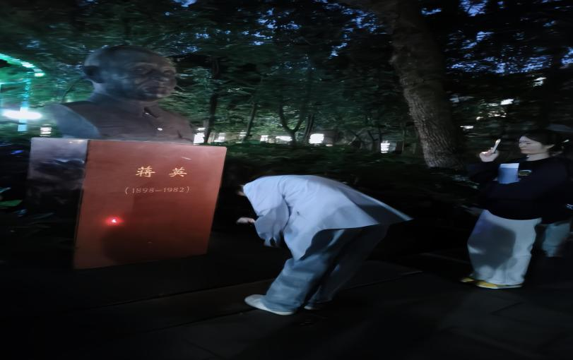 金沙路沿线的香樟树下,伫立着三位先贤的雕像,分别是林学家、教育家沈鹏飞先生,植物分类学家蒋英先生,昆虫学家李凤荪先生。3位班长精心准备了三位先贤的简介,现场发放给同学们学习了解。在先贤雕像前,周老师饱含崇敬之情,逐一介绍了先贤们的事迹及其对学校的深远影响。同学们深受感染,纷纷肃然起立。学生代表怀着对先贤的敬畏之心,双手献上三朵菊花,并深深鞠躬,表达对先辈的缅怀与敬意。