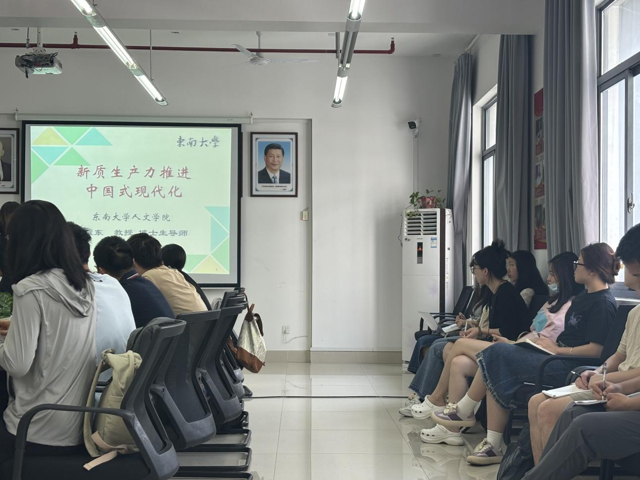 为深入学习贯彻习近平总书记重要讲话精神和全国两会精神,引导青年锚定强国建设、聚焦复兴伟业,5月27日下午,我院邀请东南大学人文学院教授、中国行政体制改革协会理事刘耀东进行以“新质生产力推进中国式现代化”为题的专题讲座。讲座在博文楼南1010室举行,讲座由学院党委书记邓集文主持,马克思主义学院科研骨干和硕士研究生参加。