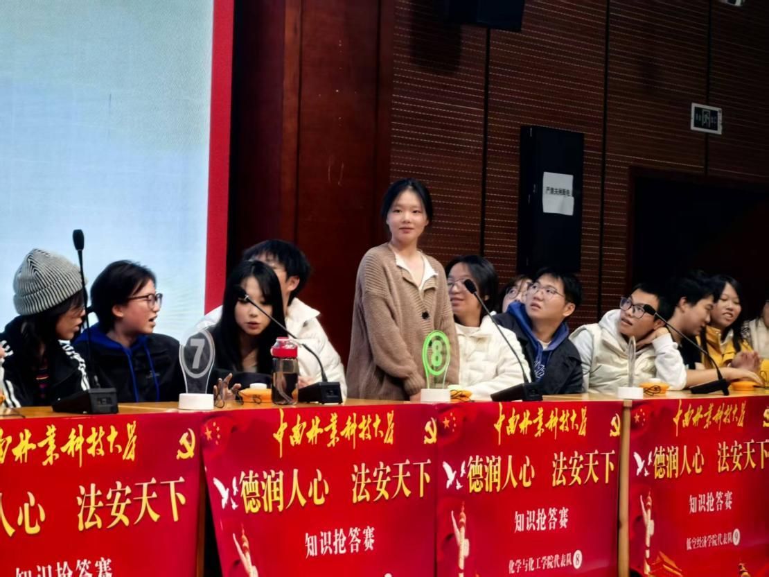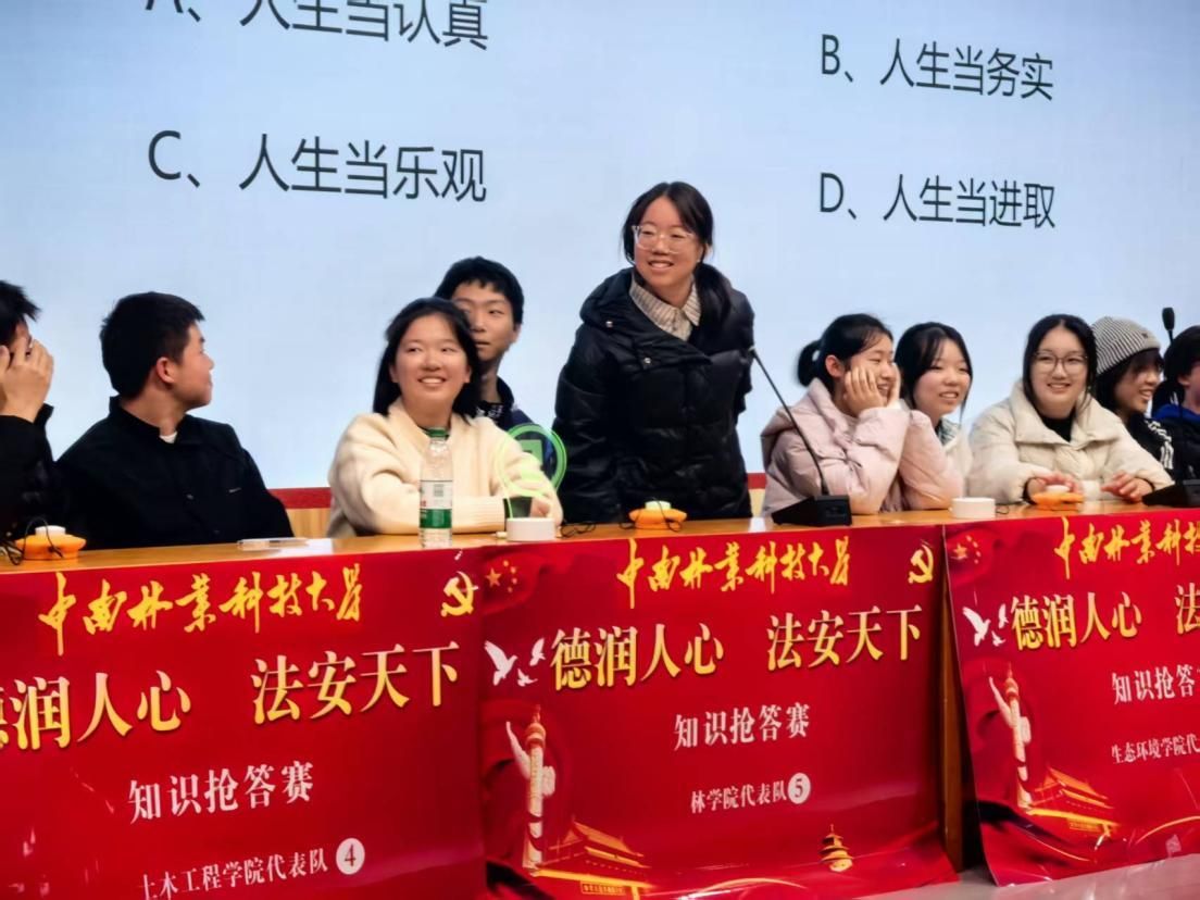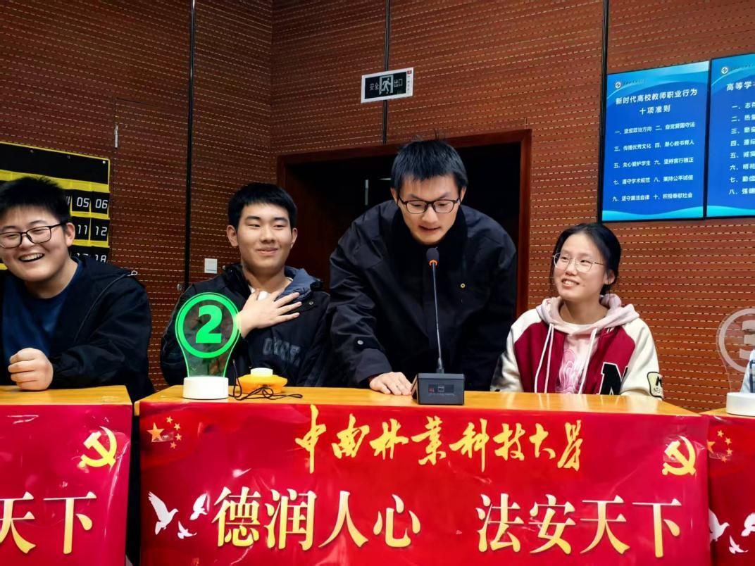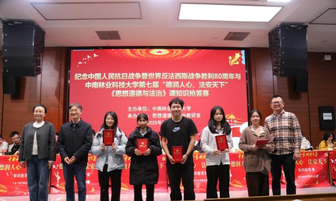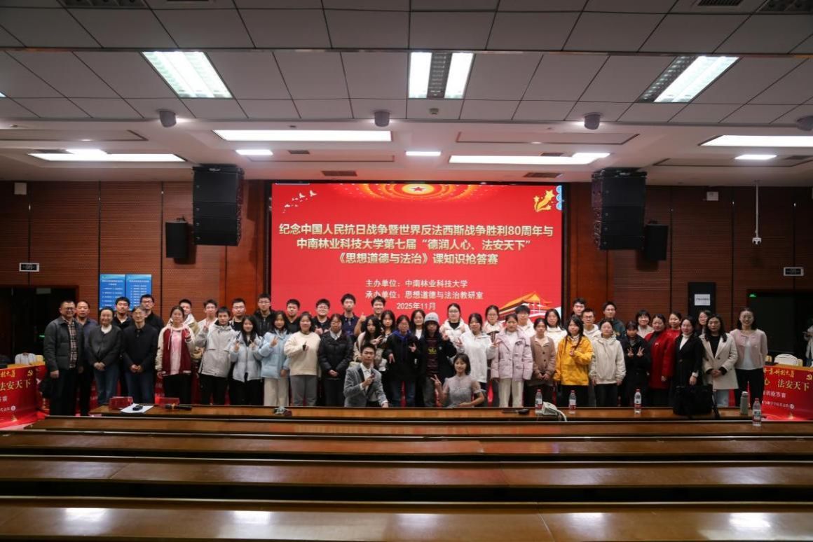 为深切缅怀革命先烈,弘扬伟大抗战精神,增强当代大学生积极参与民族复兴的责任感与使命感,11月21日晚,我校纪念中国人民抗日战争与世界反法西斯战争胜利80周年暨中南林业科技大学第七届“德润人心、法安天下”思想道德与法治课知识抢答赛在博文楼北304成功举行。本次活动旨在引导广大学生铭记历史、珍爱和平,树立正确的世界观、人生观、价值观,不断提升思想道德素质与法治素养。全校共有12个学院组队参加,近400名师生观众到场观看、参与。