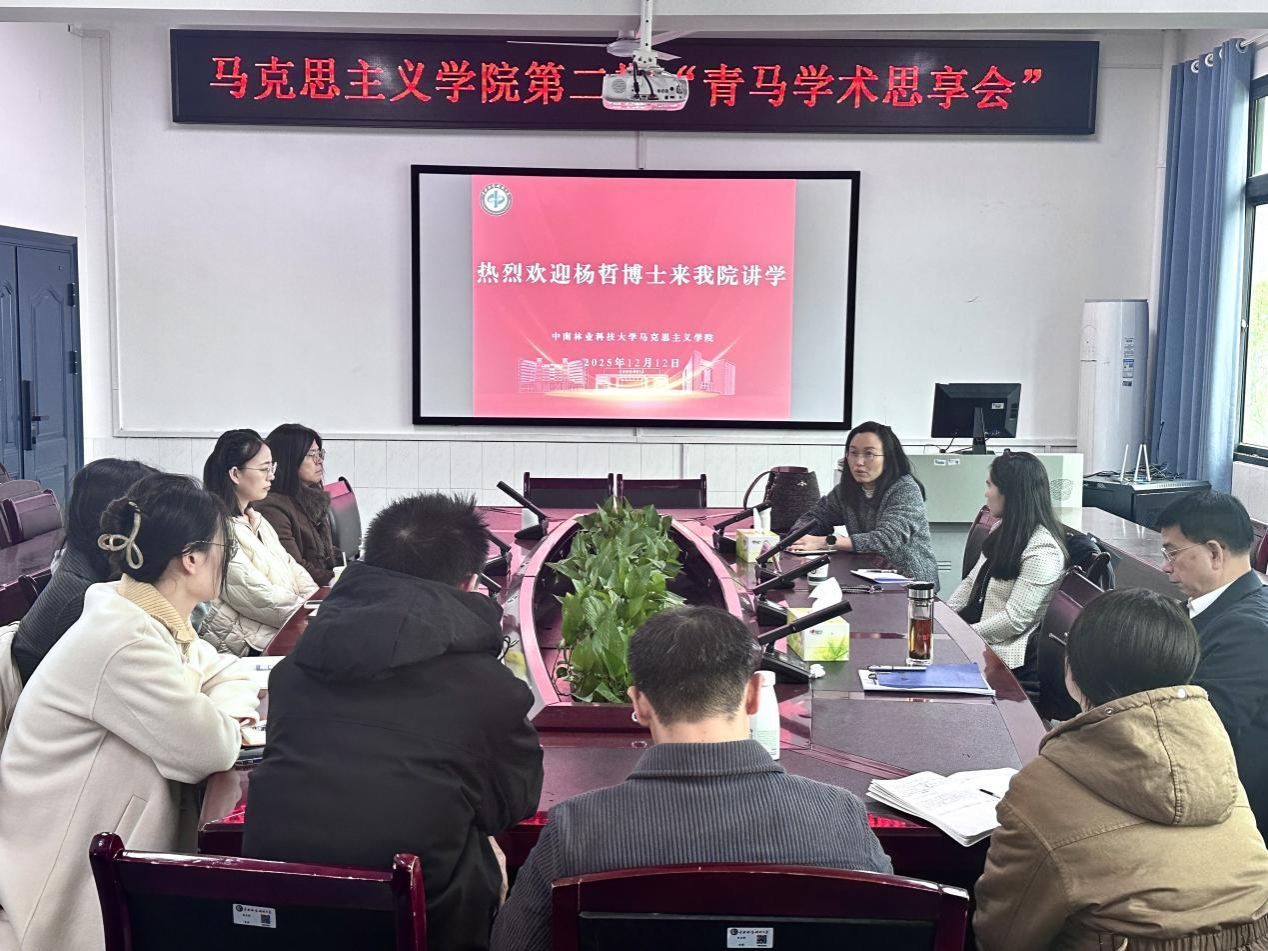 12月12日上午9点,马克思主义学院第二期“青马学术思享会”在博明楼304教室成功举办。本次思享会特邀北京林业大学杨哲副教授分享教学科研经验,校原纪委书记杨鑫铨、副院长姚遥以及学院科研骨干参加。