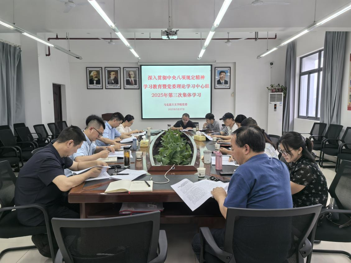 5月27日下午,马克思主义学院党委理论学习中心组在博文楼南1010会议室开展深入贯彻中央八项规定精神学习教育暨党委理论学习中心组2025年第三次集体学习。会议由学院党委书记邓集文主持,学院党委委员、姚遥、李雄光、各支部书记、教研室主任参加学习。