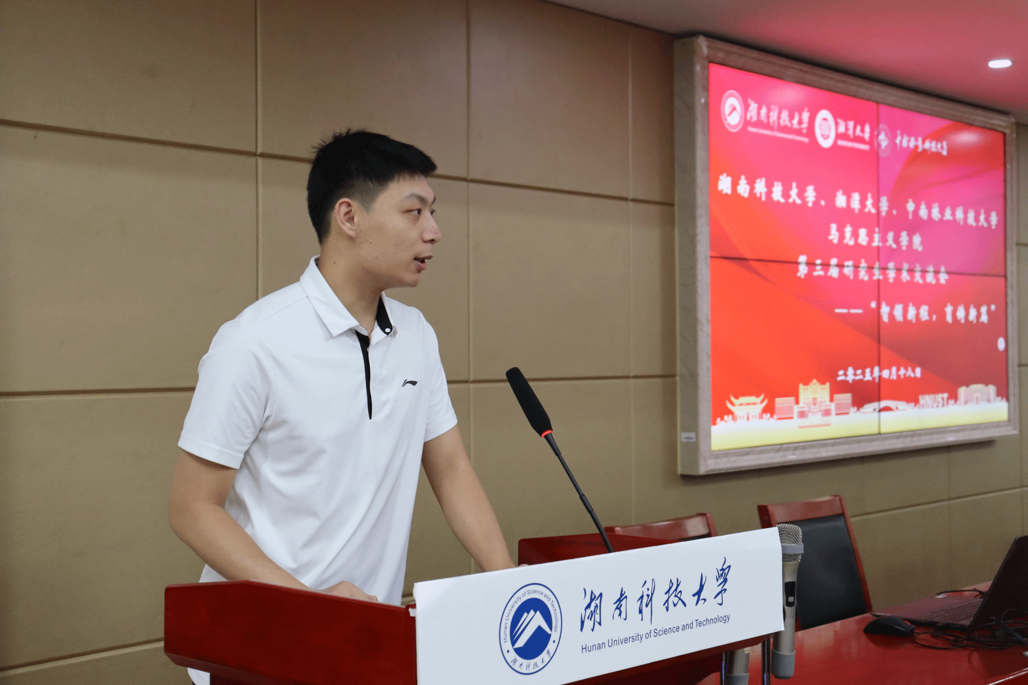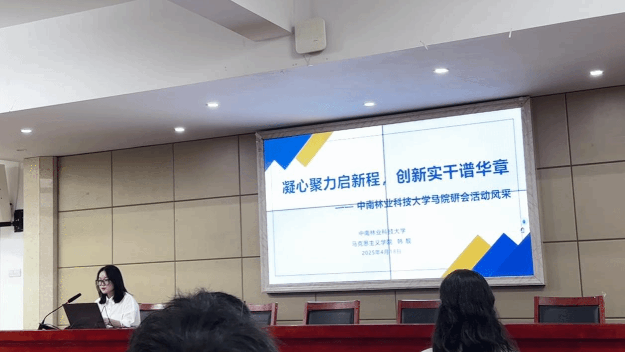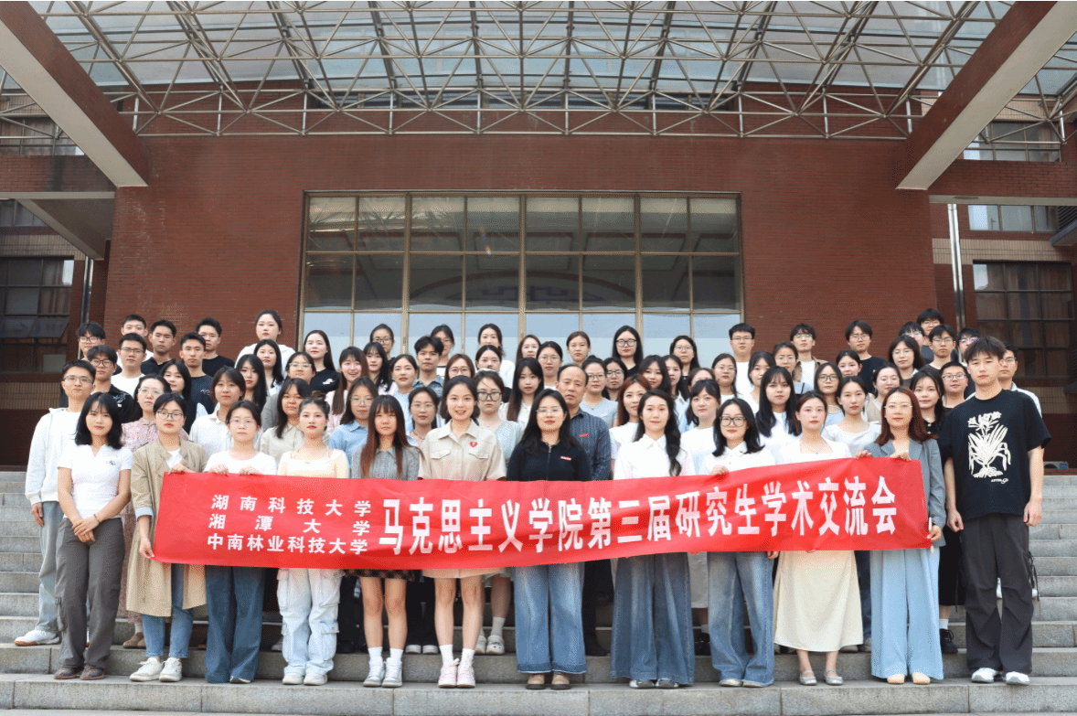 为促进马克思主义理论学科研究生之间的学术交流与学生工作创新,搭建跨校合作桥梁,由湖南科技大学马克思主义学院主办,湘潭大学马克思主义学院、中南林业科技大学马克思主义学院共同承办的“智领新程,育铸新篇”第三届研究生学术与学生工作交流会于4月18日在湖南科技大学成功举办。中南林业科技大学马克思主义学院研会执行主席尹珺、轮值主席韩靓、团委副书记刘涛以及23级班长雷桥云四位代表进行学生工作交流,五位优秀学术代表向柯旖、彭瑞琦、段力尹、苏思源、张宇在交流会上开展学术分享,他们充分展现了林科大马院学子的风采与担当。