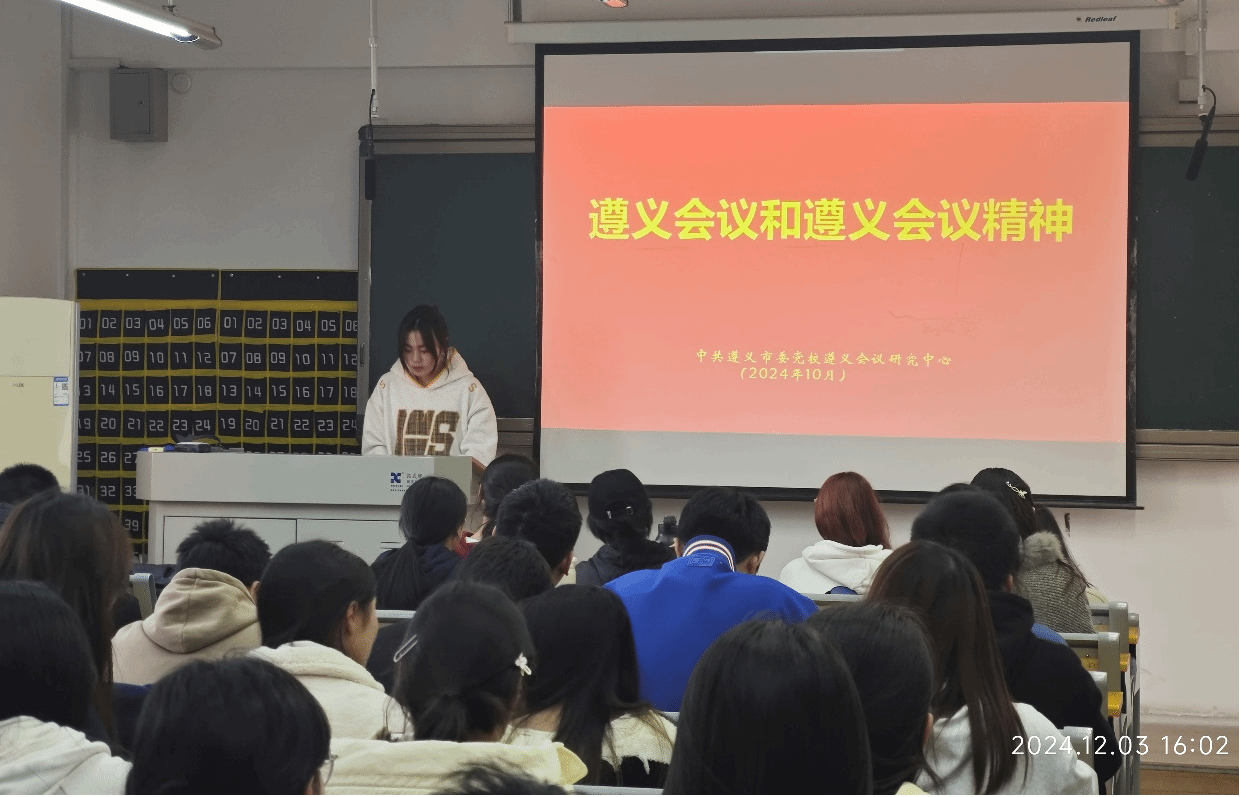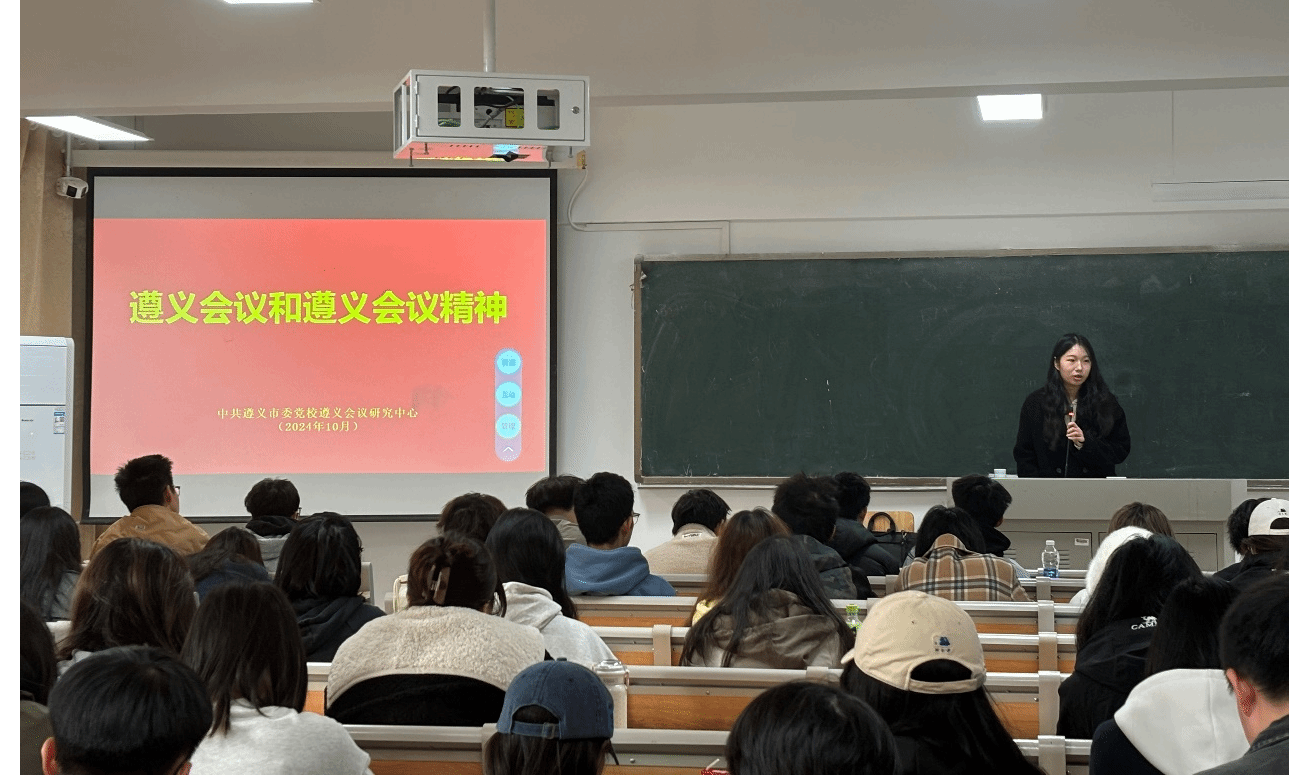 宣讲团走进本科生团支部。团队到商学院、经济学院和物流学院等7个学院本科生团支部开展了理论宣讲,宣讲团讲师通过图片视频展示和通俗易懂的讲解方式,加深了同学们对遵义会议精神的理解和掌握。商学院会计学1班蒋心怡同学表示,“通过学长学姐的讲述,我对遵义会议精神有了更深刻的理解,我深刻感悟到这份精神不仅是历史转折的智慧结晶,更如一座永不熄灭的灯塔,指引着我们在新时代的浪潮中坚定方向、勇于突破。”