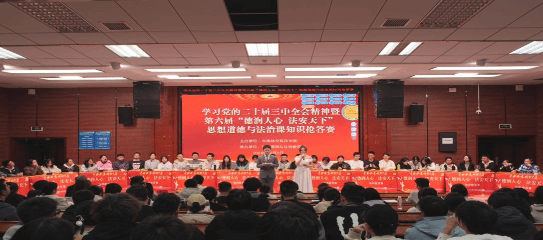 12月8日晚,中南林业科技大学第六届“德润人心法安天下”思想道德与法治课知识抢答赛在博文楼北304成功举办。此次活动聚焦党的二十届三中全会精神,旨在深入贯彻全会精神,提升师生思想道德境界与法治素养。全校共有13个学院组队参加,近400名师生观众亲临现场。