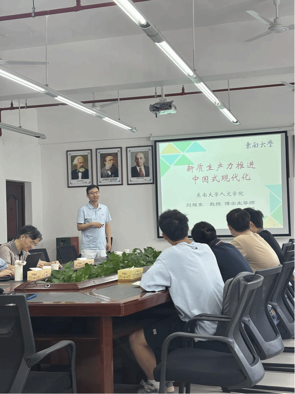 为深入学习贯彻习近平总书记重要讲话精神和全国两会精神,引导青年锚定强国建设、聚焦复兴伟业,5月27日下午,我院邀请东南大学人文学院教授、中国行政体制改革协会理事刘耀东进行以“新质生产力推进中国式现代化”为题的专题讲座。讲座在博文楼南1010室举行,讲座由学院党委书记邓集文主持,马克思主义学院科研骨干和硕士研究生参加。