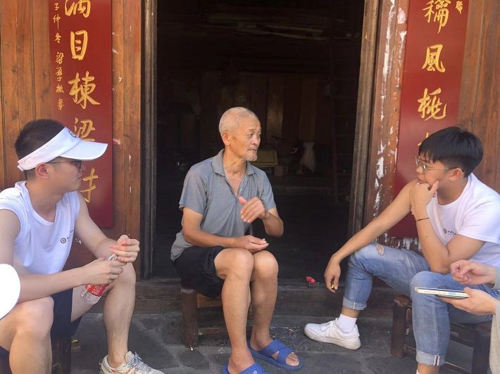 是不是每个爷爷奶奶家门口都有三两只慵懒的狸花猫呢?爬了好几层石头台阶,忽然看见了两只竹斑花猫,“这一定是施爷爷的家吧!”,同学们被烈日晒得睁不开的眼睛似见到了珍宝一般,“快看,前面那不是施爷爷吗?”不知道是我们的声音太大惊扰了正坐在家门口悠闲的摇着扇子的施爷爷,还是施爷爷老早就看见了我们的身影,他赶紧爬起身向屋内走去,不知因果的我们忽然想起了昨天村民大会中略显“羞涩”的施爷爷,还以为施爷爷要拒绝我们的采访。大家小心翼翼的走近,门口的两只竹斑猫快速的跑掉了,大家面面相觑,还来不及我们反应,只见施爷爷两手从家里提着凳子满面笑颜的说,“快坐,快坐”,大家这才呼了一口气,帮着施爷爷搬起了凳子。施爷爷仿佛知道我们要问他什么一样,坐在了中间,把凳子围成一个圆圈,大家围着施爷爷缓缓坐下,定下神,忽然发现,两只竹斑猫不知道何时又躺在了离老师不远的地方,或许猫咪们也和我们一样想听一听老师的故事吧!