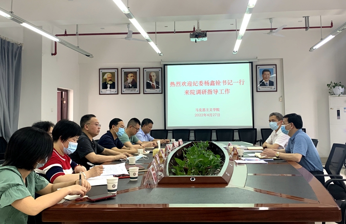 2022年4月27日下午,学校纪委书记、省监委驻校监察专员杨鑫铨一行到马克思主义学院调研指导工作。纪委副书记、纪委办监察专员办主任张学文陪同调研。马克思主义学院班子成员周预分、胡美灵、邓集文、孙欢、管贵秋及教师代表刘菁、杨泽章参加调研座谈。