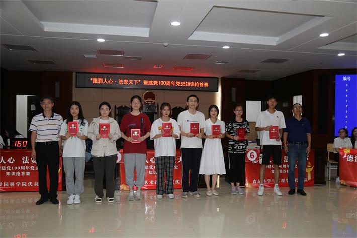 今年的抢答赛还增加了党史相关知识,共设初赛、决赛两个环节。初赛由各任课老师在全校范围内组织选拔。决赛环节来自9个学院的代表队进行现场抢答。与往届不同的是,本次抢答赛在参赛选手必答题、观众必答题、抢答题、风险答题的基础上新增了观众视频答题环节。比赛现场气氛热烈、高潮迭起,选手们精神抖擞、斗志昂扬,赛出了风格、赛出了水平,一题题精彩的抢答赢得了全场观众阵阵掌声。经过紧张激烈的角逐,最终家具与艺术设计学院和食品科学与工程学院代表荣获一等奖,风景园林学院、外国语学院及商学院荣获二等奖,政法学院、班戈学院、旅游学院及经济学院荣获三等奖。