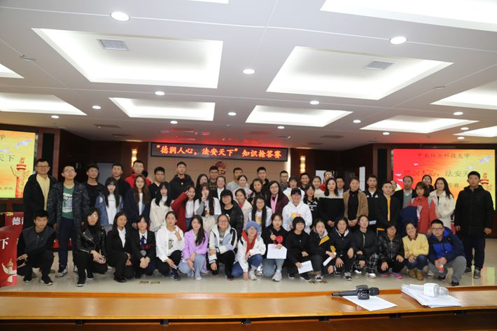 为进一步落实习近平总书记在学校思想政治理论课教师座谈会上的重要讲话精神,激发学生学习思想道德和法律知识的热情,12月13日晚,马克思主义学院在博文楼模拟法庭举办了《思想道德修养与法律基础》课“德润人心•法安天下”知识抢答赛。来自各学院的300余名学生共同观看了比赛,比赛由思想道德修养与法律基础教研室承办,结合《思想道德修养与法律基础》课程中“中国精神、为人民服务的人生目的、社会主义核心价值观、社会主义道德观、社会主义法制观”等有关内容开展。